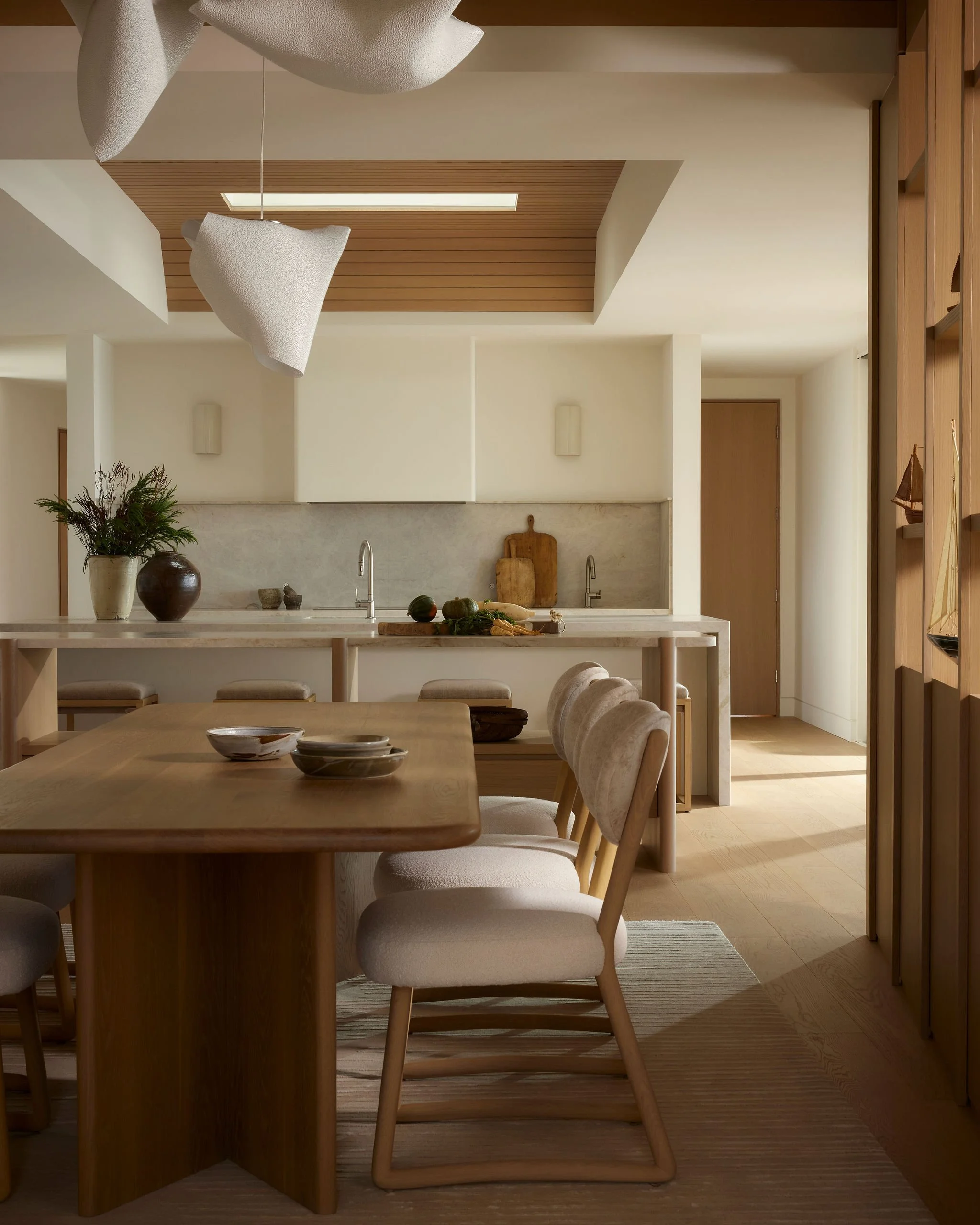 Project Description: Set along the shoreline of Georgian Bay, this beach house offered the opportunity to resist the expected language of a rural home. Rather than leaning into overt cottage cues, the interiors balance crisp architecture with softened, sculptural forms. Wood ceilings introduce rhythm and warmth, while curved furniture, structural lighting, and subtly contoured joinery temper the home’s linear structure. Angled wood walls conceal structural beams along the entry and extend into the dining room, creating an open-air dining space at the centre of the ground floor with uninterrupted lake views.